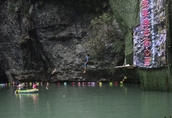 9月25日,在湖南张家界茅岩河景区举行了一次由专业高台跳水运动员参与的跳水挑战活动。